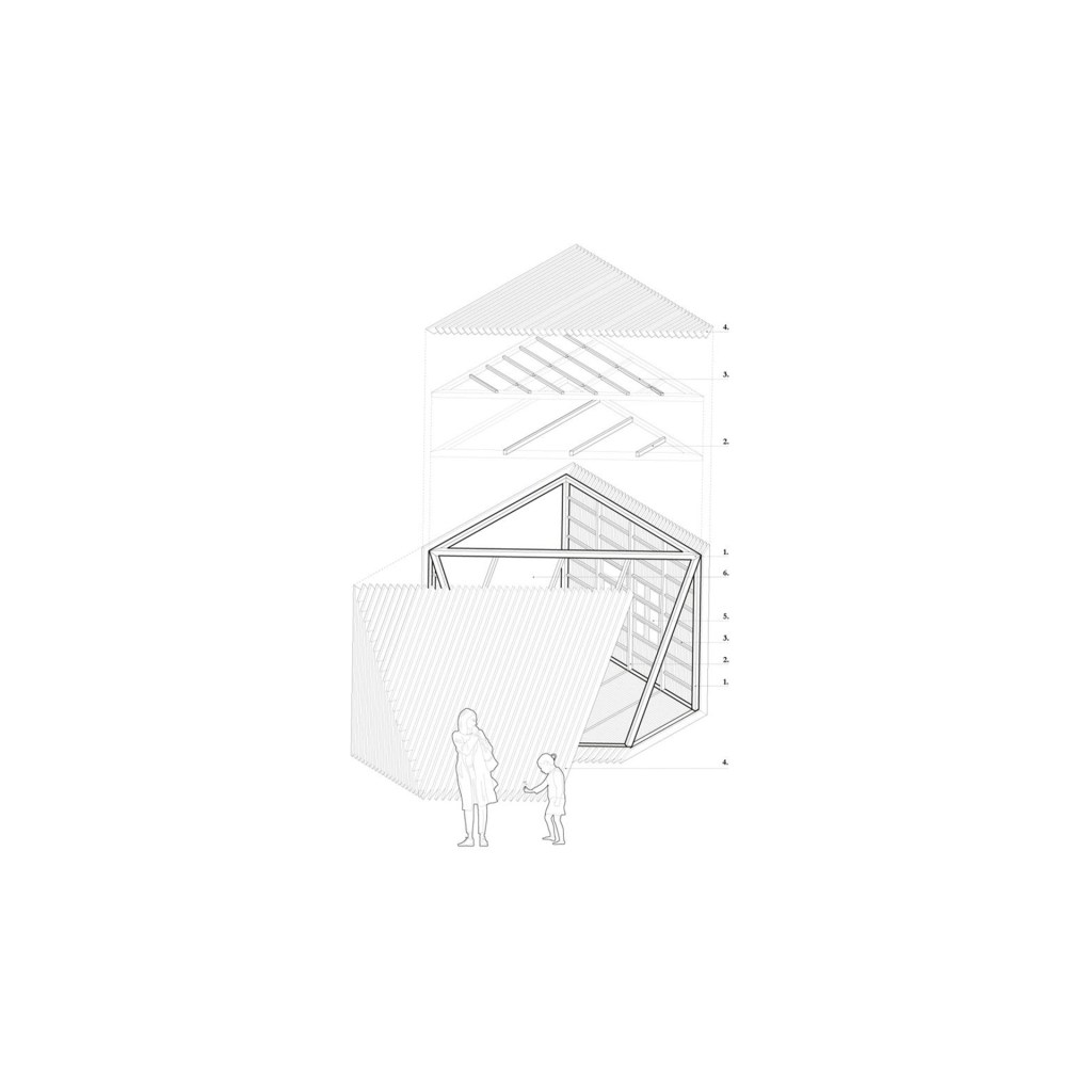 From an architectural point of view, the device has an irregular polyhedral shape derived from the facet of a 4x4x4m cube and composed of 7 faces. Each face can serve as a support base and offer a different configuration to the entire geometry. The structure is composed of a load-bearing wooden skeleton, with supporting joists and a sub-structure used to attach the outer cladding. The latter consists of light natural wood strips running parallel to the geometry of the polyhedron. Depending on the face chosen as the support base, the outer cladding is interrupted to create openings and landscape frames. In each observatory a large map of the Bormida will tell us where we are and what configuration we are experiencing.