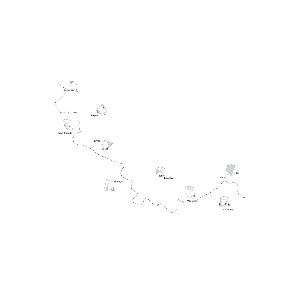 The inspiration comes from a simple story we used to learn as children, the first time we encountered the river. It is the story of the stone that, transported downstream by the river, evolves and shapes its form. With the same principle, the observatory “rolls” from village to village, taking on nine different configurations and nine different relationships with the typical features of the landscape – framing one time the river, another the sky, the hills, the vineyards, the forest, the horizon.