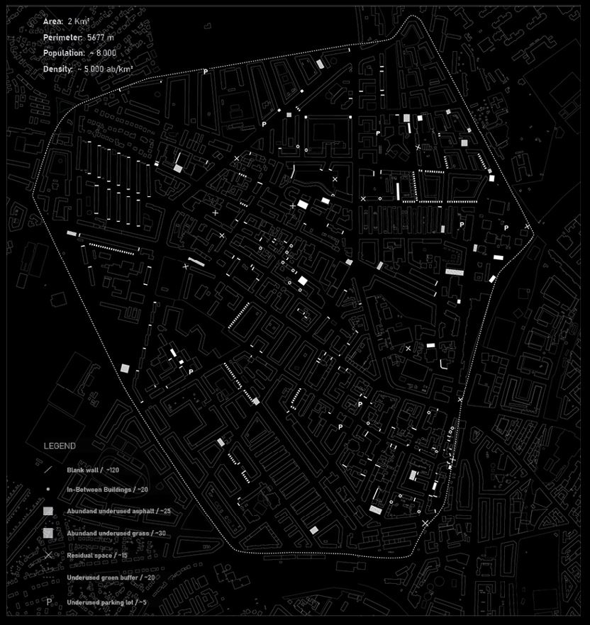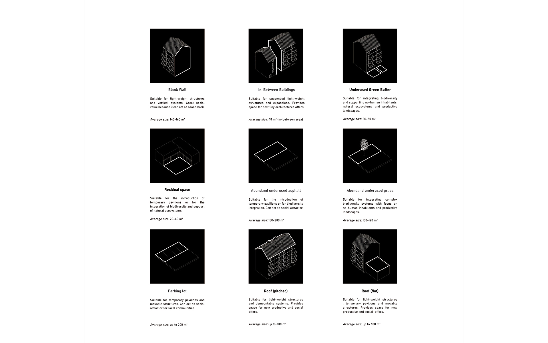 To explore the concept, two steps has been done so far: 1. A first mapping has been carried out on a 2 sqKm portion of Nordvest, Copenhagen. This survey identified over 200 underused spaces, spanning a potential usable area of 25,000-30,000 sqm. 2. A second step explored the spatial potential of these spaces through 16 prototypes that focus on providing spaces for cultural activities and local communities, food production, greenery, and biodiversity. This first approach helped to demonstrates the abundance and the richness of this spaces.