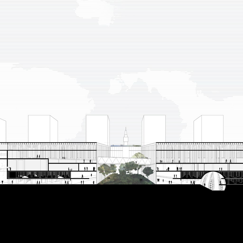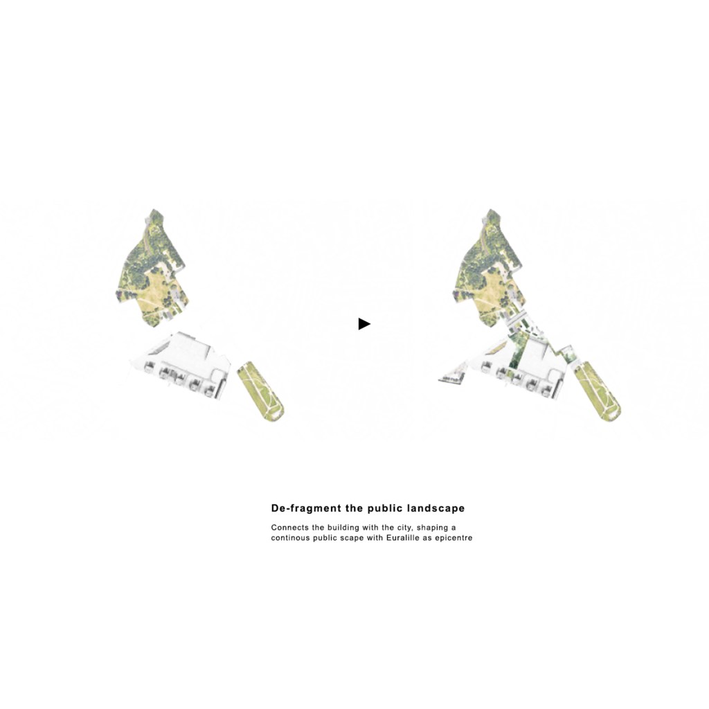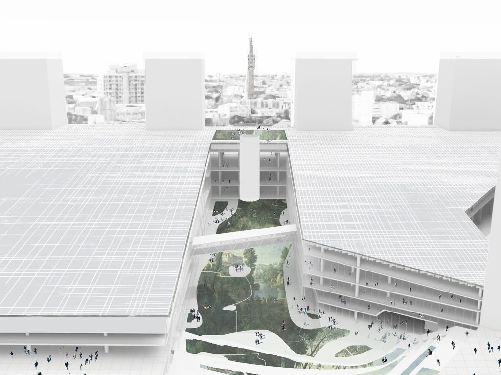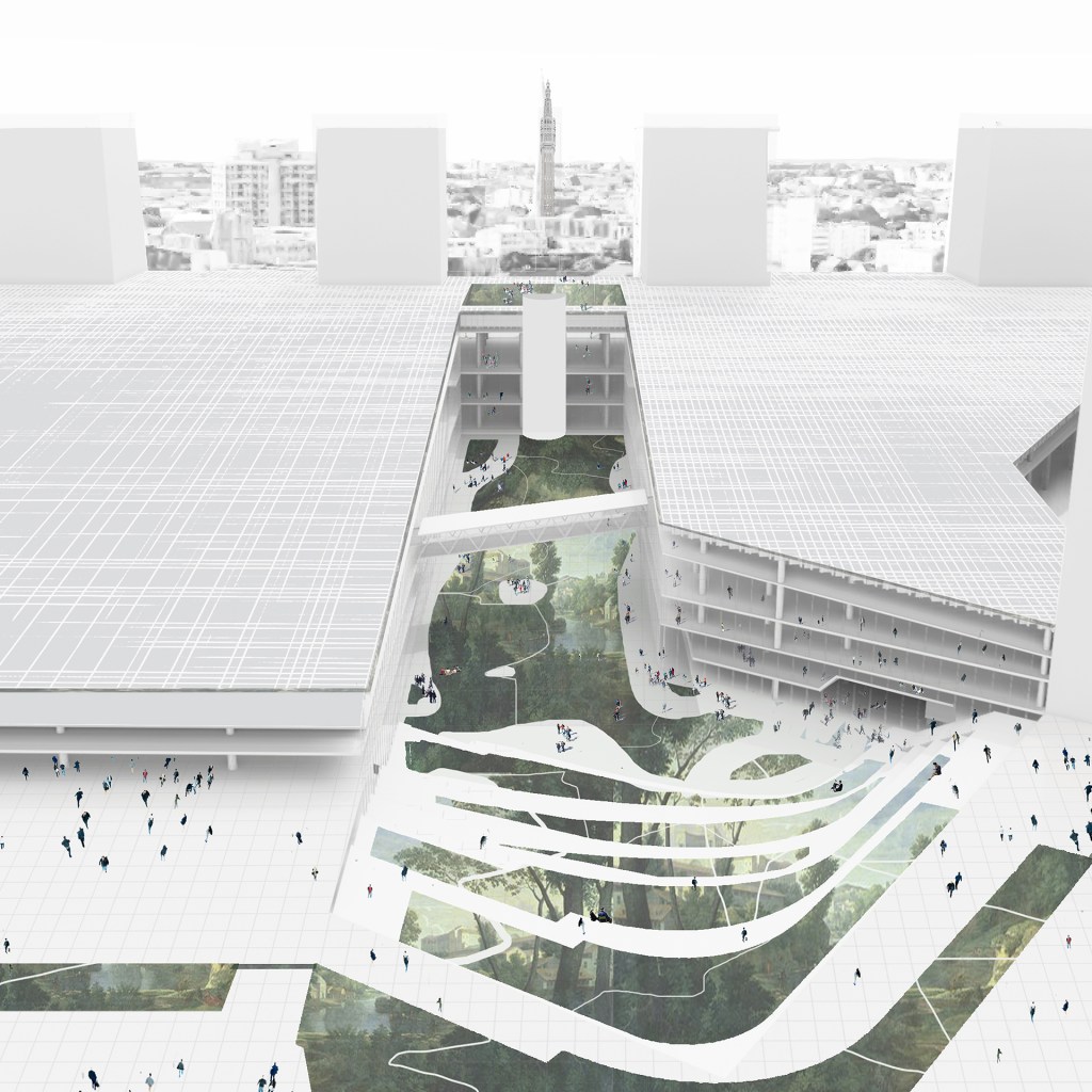 The concept is investigated in Euralille, Lille, France, a 155.000 sqm multifunctional building designed by Jean Nouvel that includes a shopping centre, five towers, one hotel, one housing block and 40.000 sqm of underused underground parking on two levels. The main gesture of the project is a twenty metres wide cut that opens up the building introducing natural air and daylight to the lower levels, while connecting the urban life of Place François Mitterand with Euralille with more than 6000 sqm of public realm, rich vegetation, south-facing seating, spaces for gatherings, paths and pocket gardens.