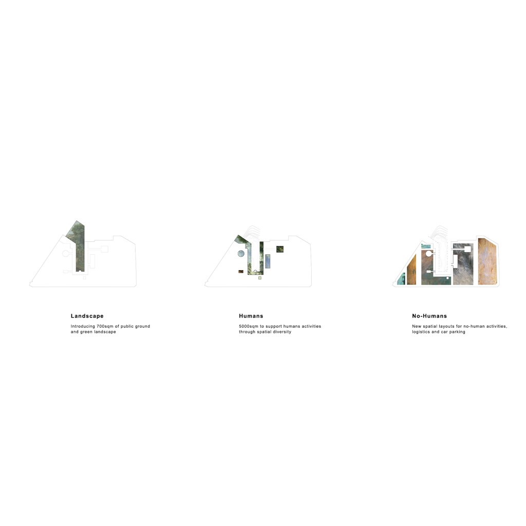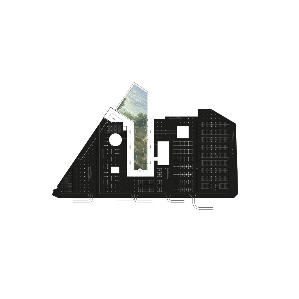 The former underground parking spaces positioned along the cut, are converted in bright double-height coworking spaces and retails. Secondary rooms transcend the scale of the building and use their groundscape uniqueness to become containers for creative activities, exhibitions and events. The rest of the carpark evolves its spaces to offer flexible layouts for new activities and needs, not only related to future mobility but also for deliveries, storage and potential non-human industries.