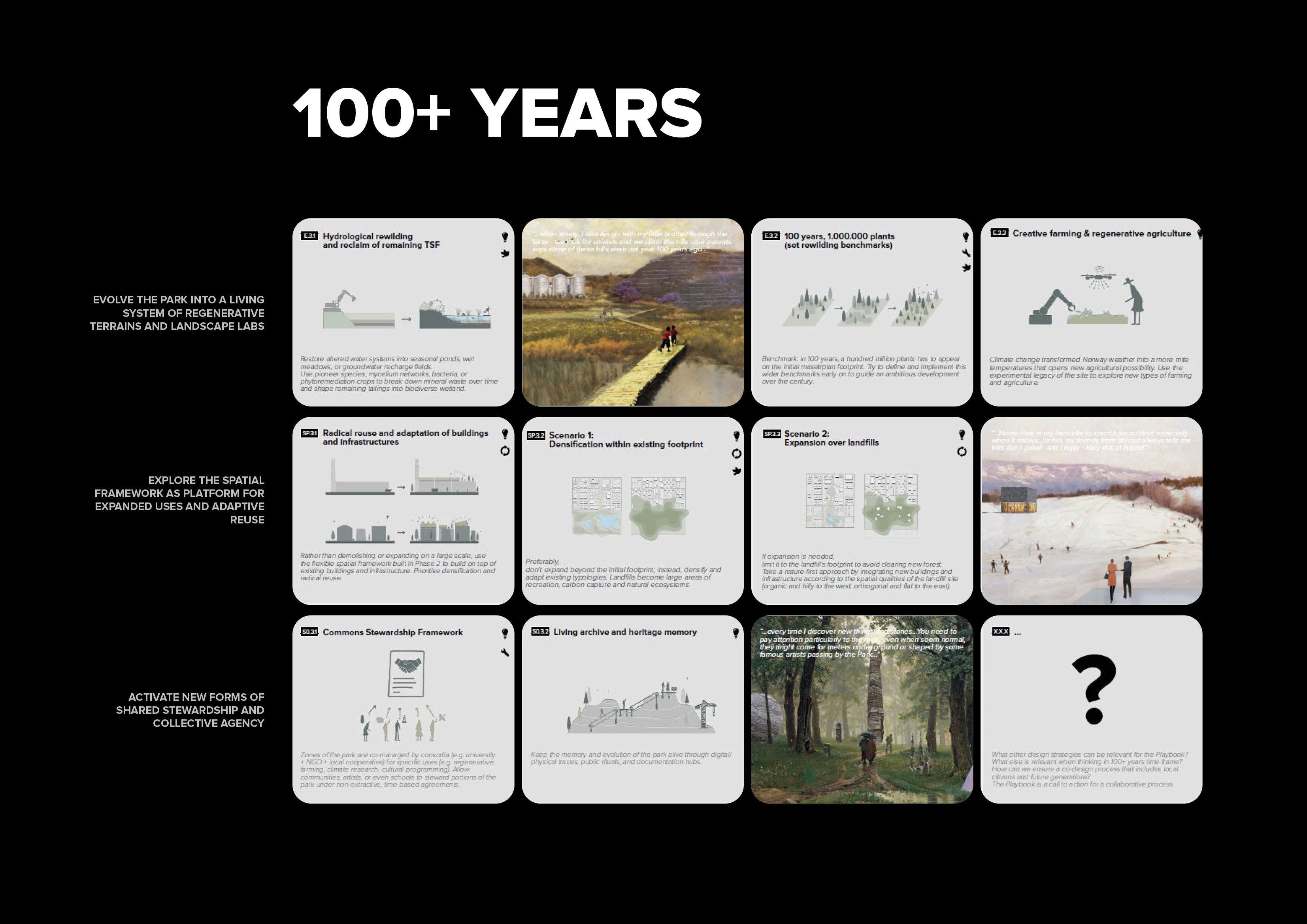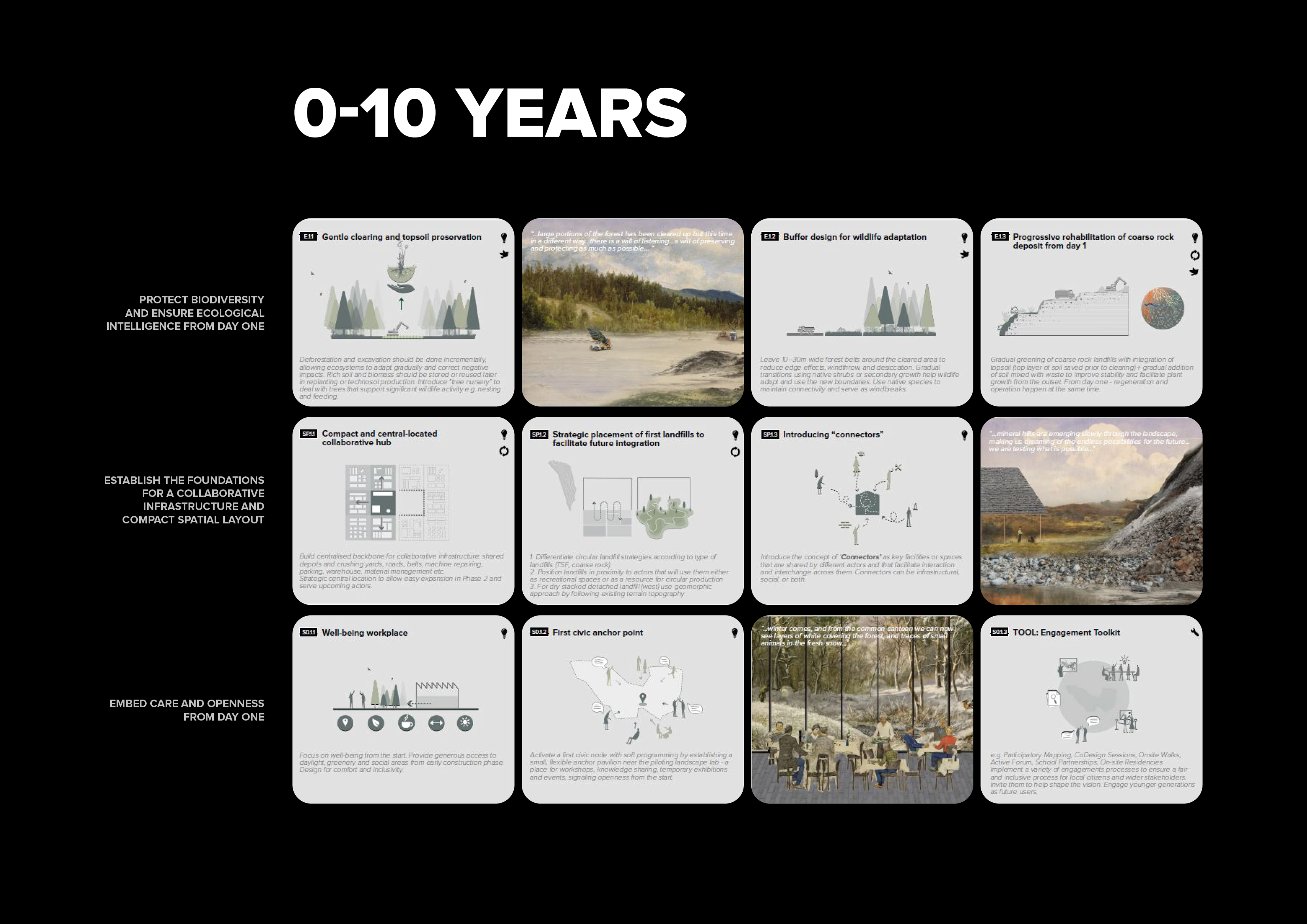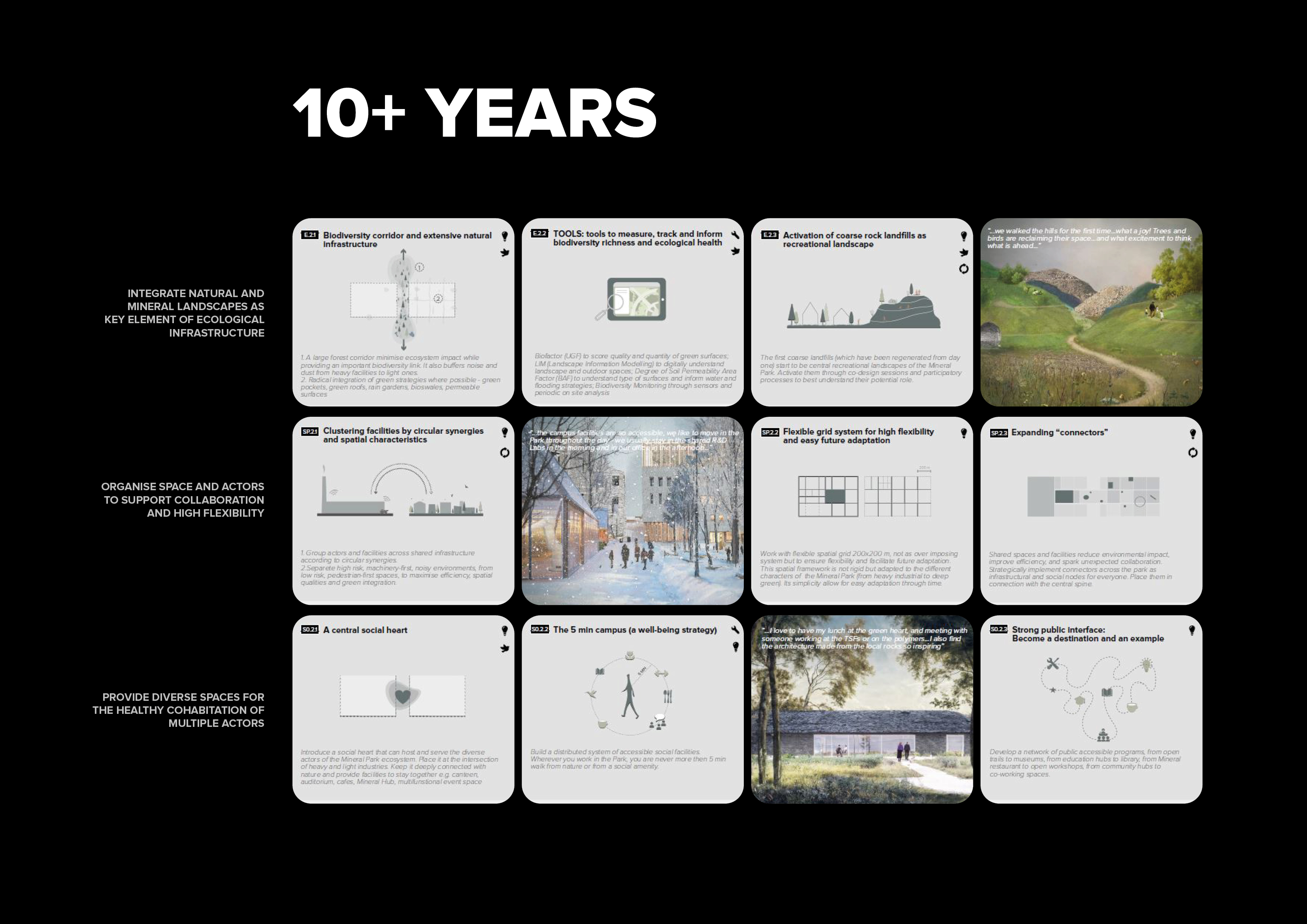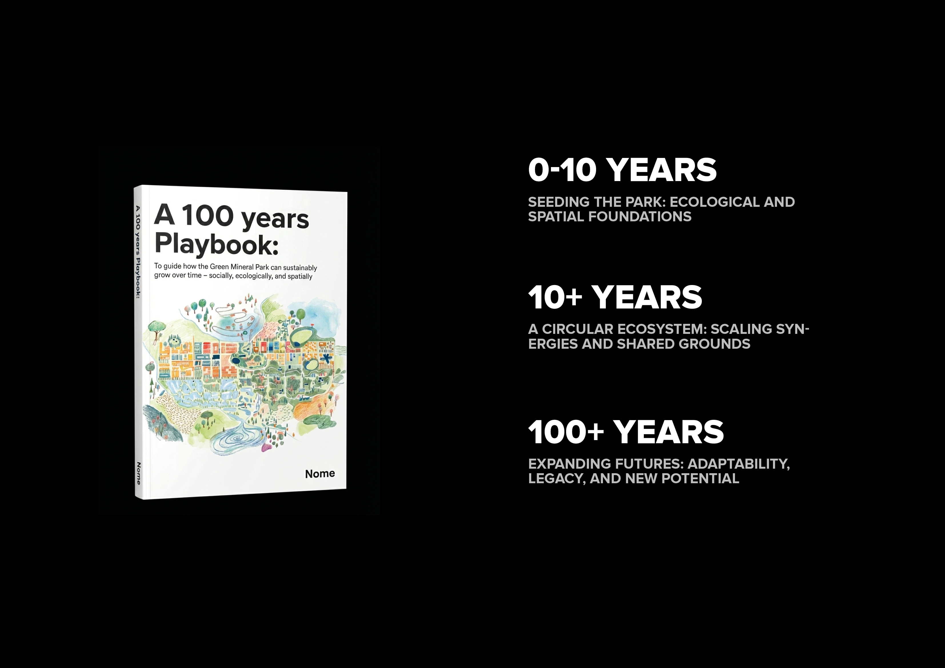 Instead of a fixed masterplan, the Playbook illustrates guiding principles, design strategies, tools and visions that adapt across decades: from the first phase of extraction and construction, to the realisation of the polyactor campus, to potential futures of reuse, rewilding, and civic renewal. Trough the three temporal scales the mining park is treated not as a static facility, but as a living ecosystem shaped by collaboration, care, circularity and long-term territorial care.
