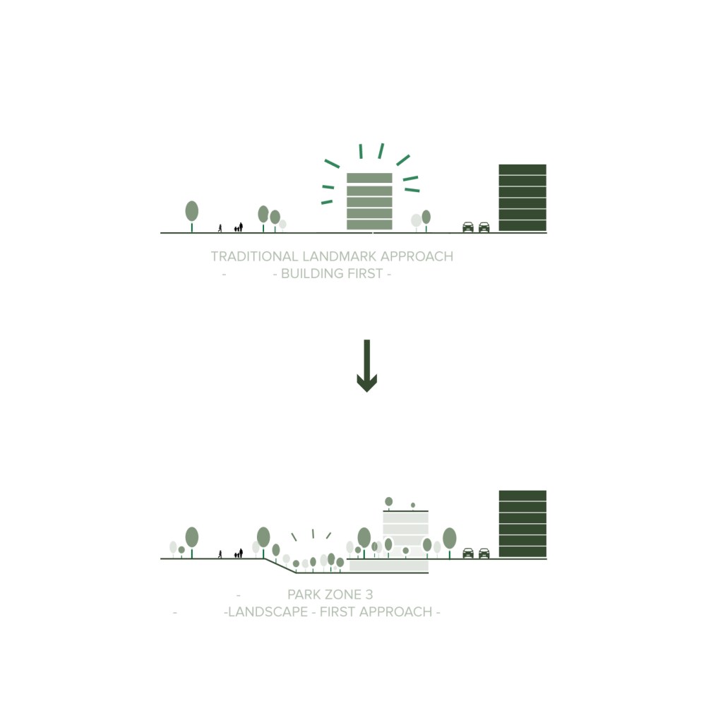 monument, proposing instead a landscape-first intervention that transforms