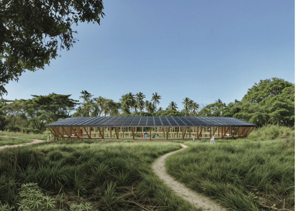 Constructed primarily from timber, the structure embodies a dialogue between ecological sensitivity and technological innovation, with its solar canopy rising as a distinctive symbol of resilience and regeneration.