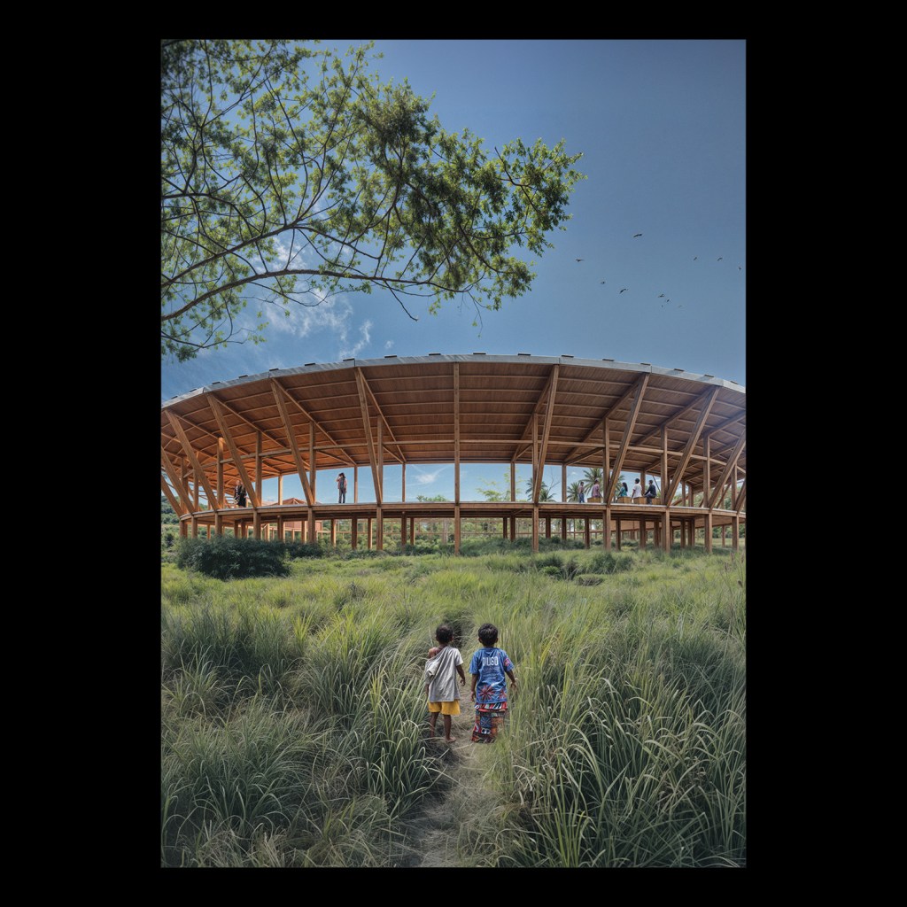 Shaped as a 40-meter-wide circle, the installation blends gently into the rich Fijian landscape, while actively contributing to its vitality. Its elevated solar canopy, crafted from over 300 monocrystalline solar panels, generates renewable energy, collects rainwater, and shelters over 600 square meters of shaded space beneath, offering a platform for everyday community use.