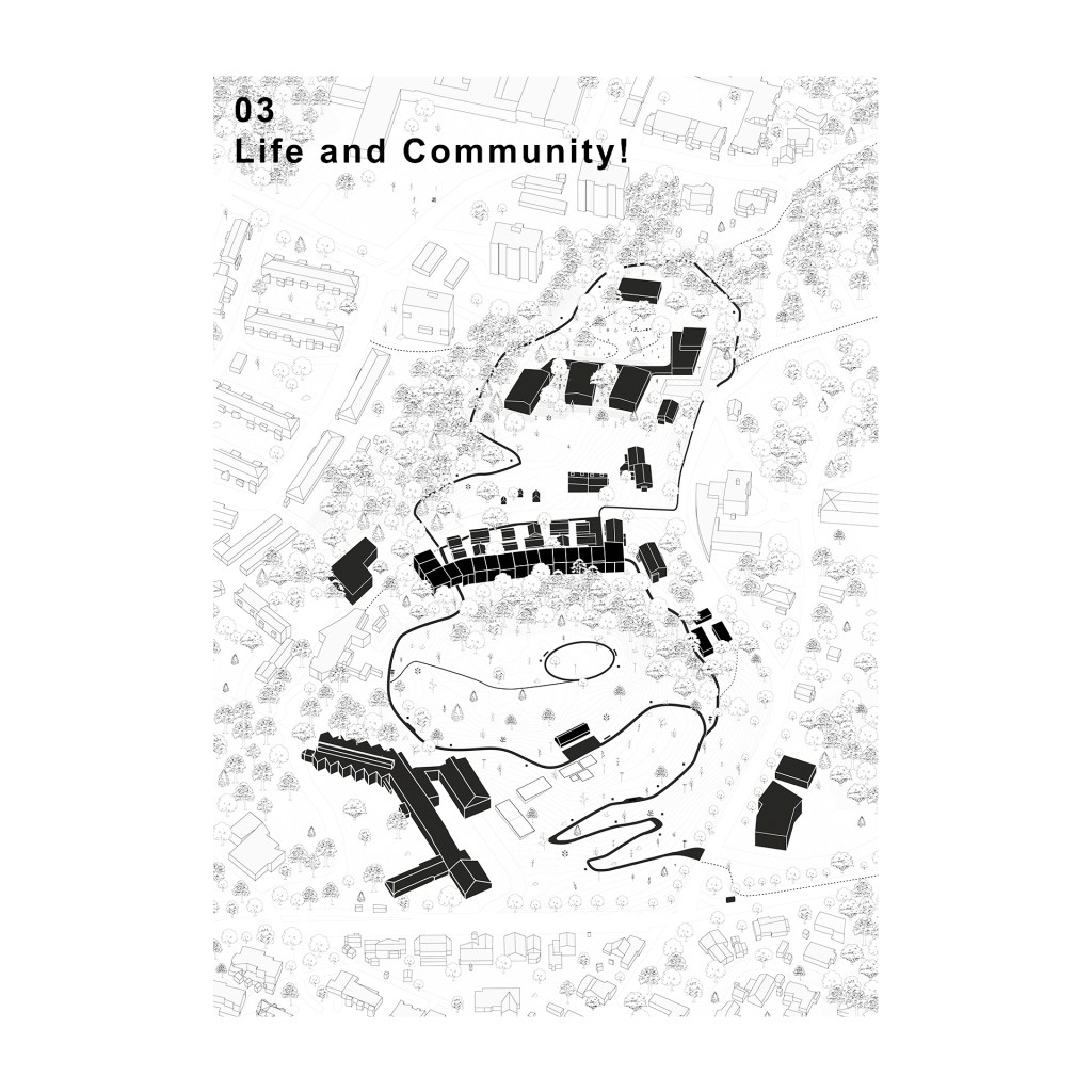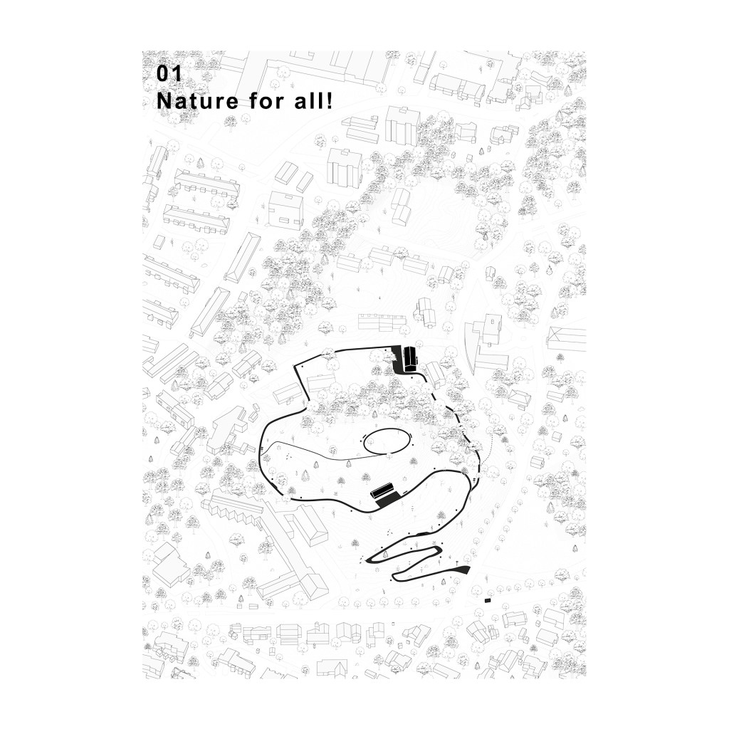 In particular, the project tries to approach the landscape as a transformative element, capable of providing therapeutic, recreational, and meditative experiences, while encouraging the coexistence of diverse species.To detail this vision, we propose three distinct phases: nature for all!, recreation and care, life and community.
